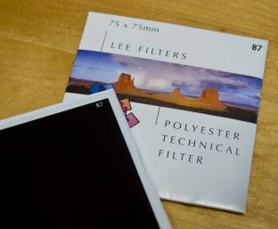 This piece of polyester filter material passes near infrared light longer than 720 nm and passes almost no visible light. The 2 cm by 2 cm square is large enough to convert four typical small Canon PowerShot or other small point and shoot cameras so that they capture pure infrared photos. If the camera's internal IR block filter (typically 8 mm by 9 mm) is replaced with a piece of this filter, only infrared light will reach the sensor. After removing the IR block filter, the Wratten 87 filter can also be placed in front of the lens. Such converted cameras can be used in a dual camera system to capture pairs of normal and infrared photos for producing NDVI (Normalized Difference Vegetation Index) and false color infrared images for landscape and vegetation analysis. The IR photos they take are also beautiful in their own right. Learn more about using this filter here.