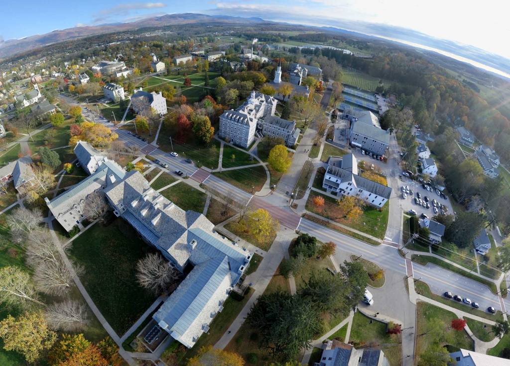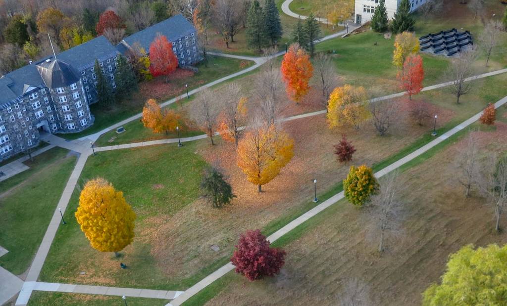 | A bunch of residence halls, Adirondack House, and the science building at the west edge of campus. |