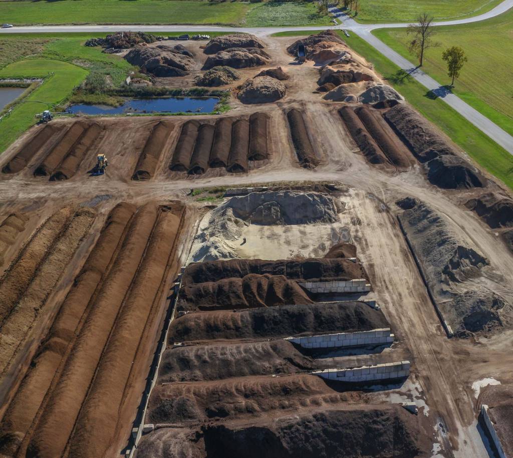 | Windrows of compost and piles of many types of raw material and finished product are arrayed in the yard. |