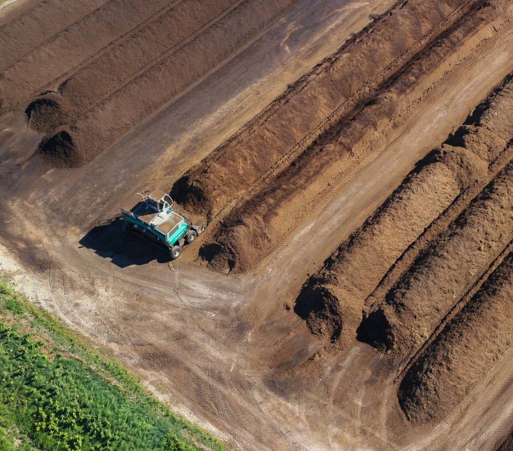The windrow turner was operating when my camera was in the air, so it captured the huge machine incorporating air into the long piles to maintain an aerobic decomposition process. Always the innovators, the Fosters are starting trials to capture the heat generated by the compost by laying pipes under the windrows. The heat could be used to dry the finished product or heat buildings in the cold season.