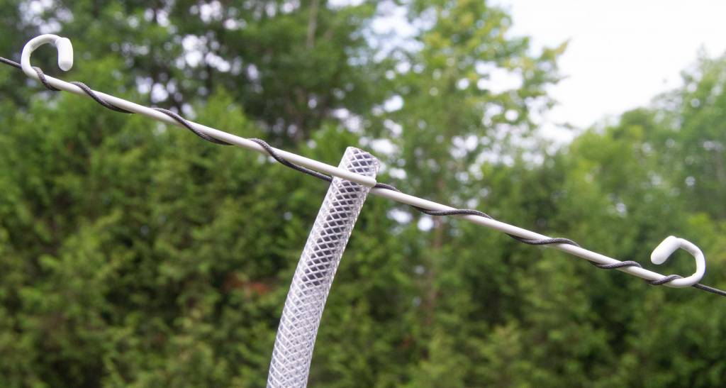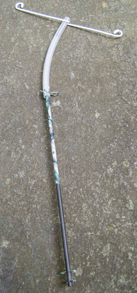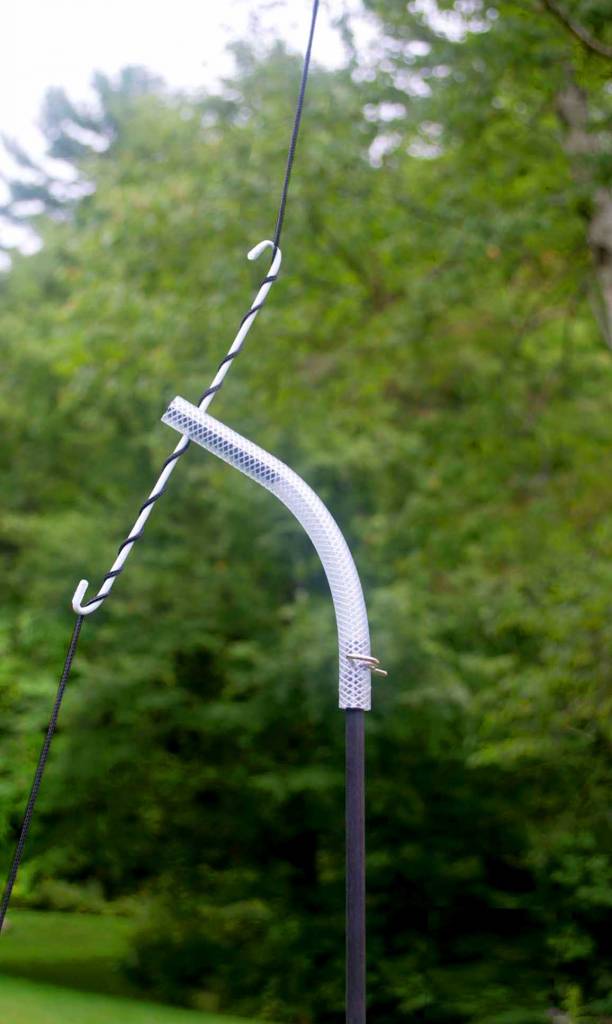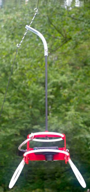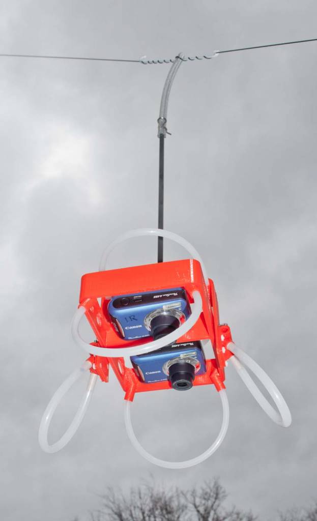 A pendulum suspension works great on balloon flights because the flexible damping tube holds the camera away from the line. Just wrap the flying line several times around each end of the stiff wire at the top. A 38 cm long carbon fiber tube tends to hang vertically to keep the camera rig steady and completely eliminates camera spinning. Attaches easily to the Redstone, Aerobee, and Titan 2 rigs. A safety lanyard is included for a redundant connection between flying line and camera. There are no 3D printed parts in this suspension. For more details see Guides.