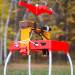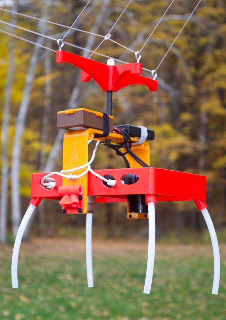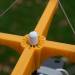 The Picavet has two clip-on attachment points to the kite line about five feet apart, and the Picavet lines pass through four eyes on the Picavet cross. These multiple attachments reduce rotation of the rig and swinging of the rig along the axis of the kite line. The three inch shaft between the cross and the rig acts as a moment arm and allows the mass of the camera to level the rig. The star on the top of the Picavet cross allows the attached rig to be pointed in any of 15 directions.