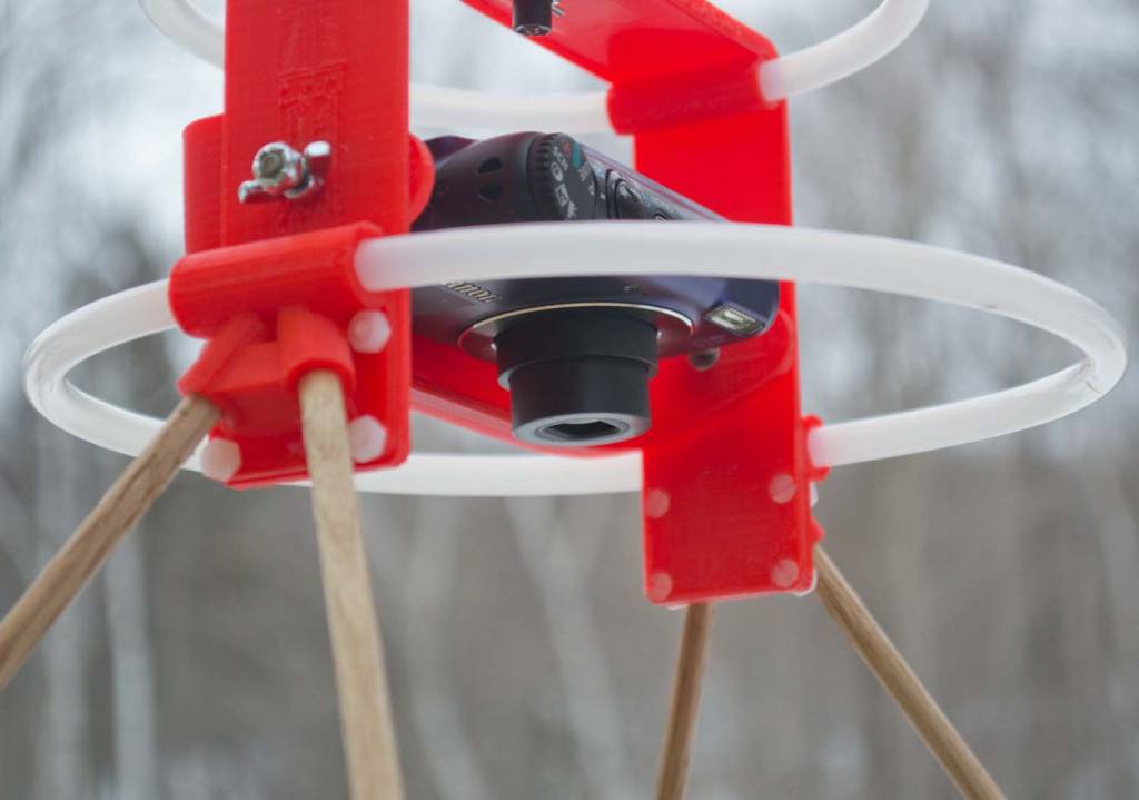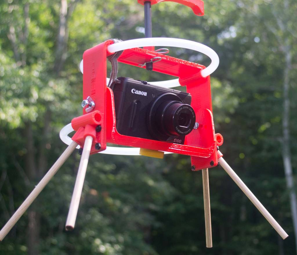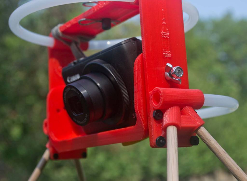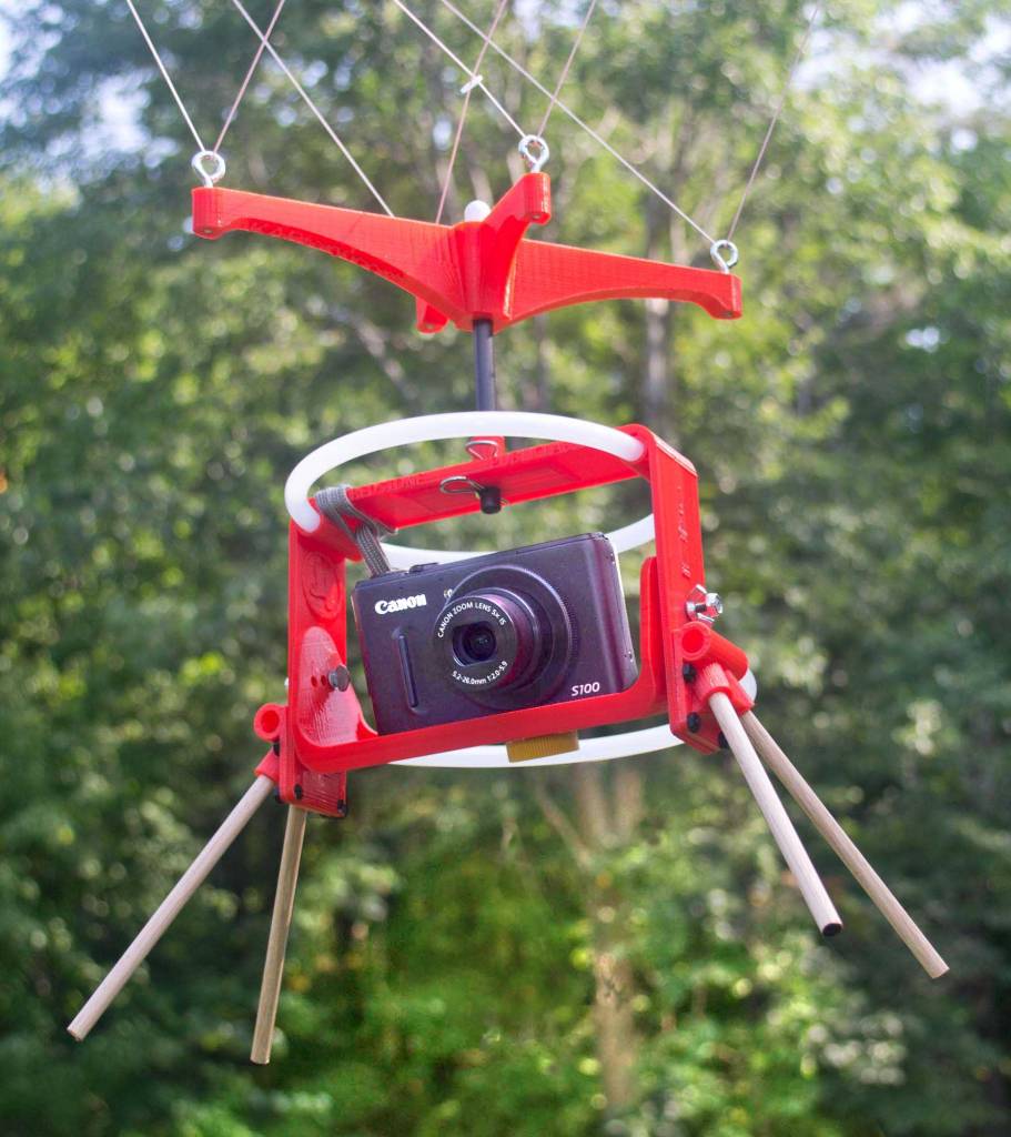 The Redstone Rig Kit includes all the pieces to build a ready-to-fly rig for holding a small point & shoot camera pointed at any angle. This includes four 3D printed parts and the hardware to hold them together. The articulated camera tray allows vertical shooting for mapping and also oblique photography with the rig balanced regardless of tilt angle. The camera (not included) is attached with a thumb screw (included) into the tripod socket so it stays securely pointed in the same direction. The camera controls and LCD screen are always accessible. Protective legs and bumpers (included) can be quickly configured in various ways for different needs. The rig can be easily suspended from the flying line using either a Picavet or pendulum system (select above).
