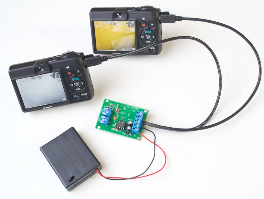 This timing circuit outputs 5 volt pulses to the USB ports of Canon PowerShot cameras to synchronize the release of their shutters. When the remote function of CHDK is running on both cameras, the start of a pulse to the USB ports activates a "half press" of the shutter button and all automatic focusing, exposure, etc is done. When the pulse ends, the shutters of both cameras operate simultaneously to take perfectly synchronized photos. The timer allows adjusting both the interval between pulses (2.5 to 60 seconds) and the duration of the pulses (0.5 and 5 seconds). An indicator LED is lit during the pulse.