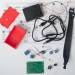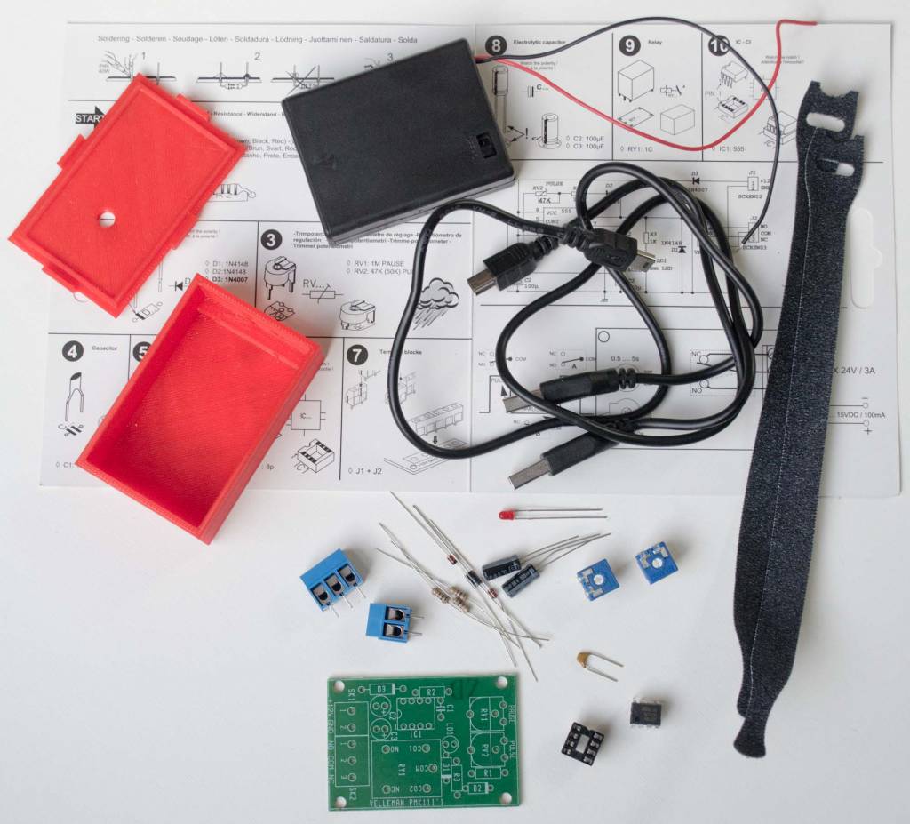 Includes circuit board and components, 3D printed enclosure, battery box with on/off switch (for four alkaline AAA, not included), two Mini-B USB cables, two Velcro ties, jumper wire, heat shrink tubing, lock washers, Velcro tape for the case bottoms, and the MK111 assembly instructions and specification sheet.