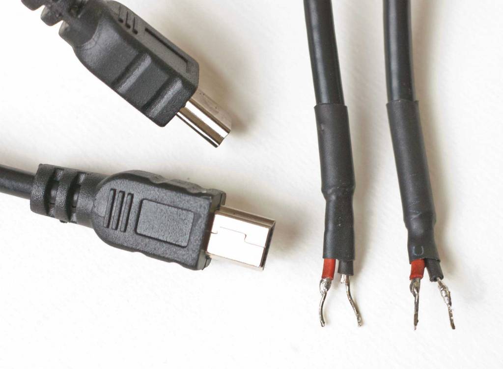 - Cut the large USB A connector off the USB cable and strip the ends of the red and black wires.