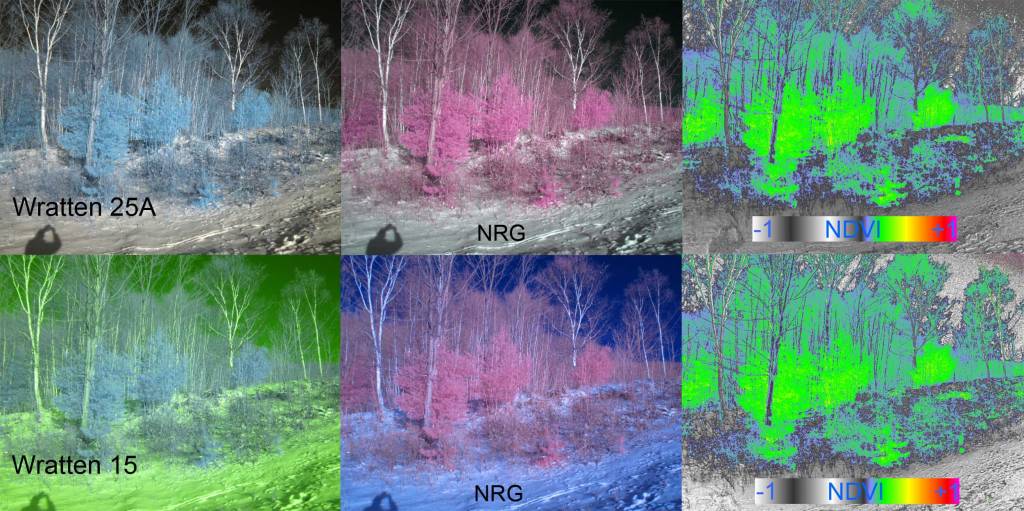 This square of Wratten 15 gelatin filter is large enough to convert four Canon PowerShots or other point and shoot cameras to plant analysis cameras. The small PowerShots typically used for aerial photography have an internal infrared block filter that is 8 mm by 9 mm. By opening the camera and replacing that filter with a rectangle cut from this filter, the camera will record near infrared light in the blue channel and mostly red light in the red channel. Those two channels can then be used to produce Normalized Difference Vegetation Index (NDVI), and along with the green channel can produce false color IR images. Unlike the Wratten 25A filter, the Wratten 15 does not block green light, so the green channel is more useful for false color IR images and other visualizations. This 2 cm x 2 cm square can also be used in front of the lens of a camera which has had its IR block filter removed. There is more information about this filter at Public Lab.